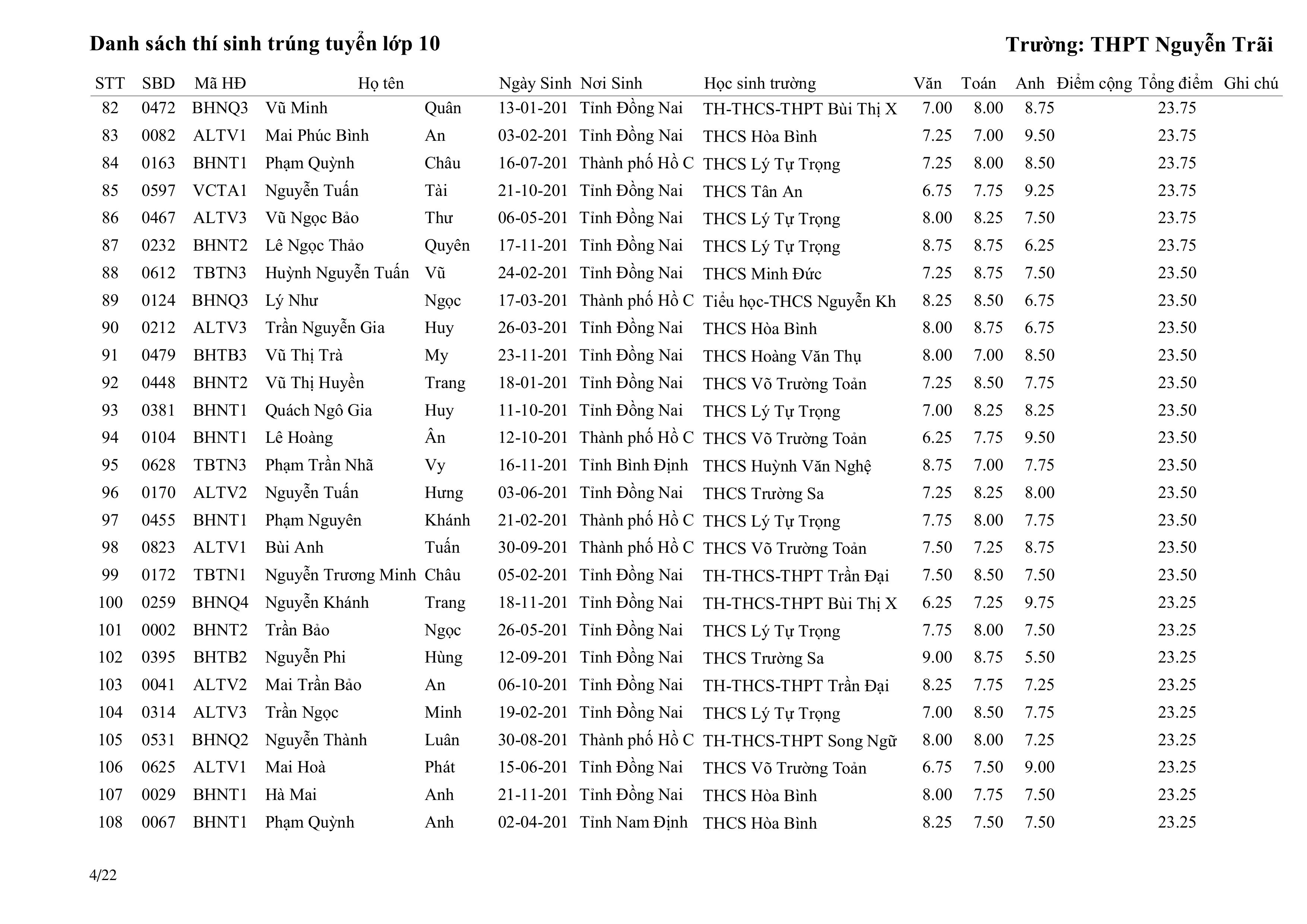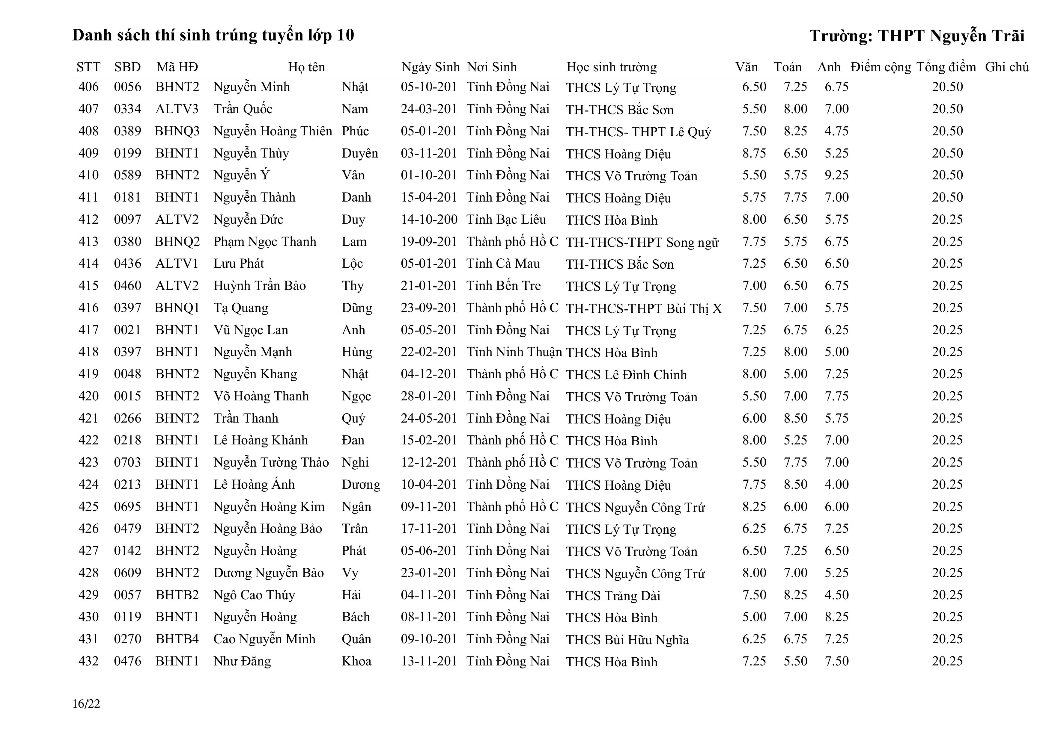 Danh sách học sinh trúng tuyển vào trường THPT Nguyễn Trãi năm học 2025-2026 và thời gian nộp hồ sơ nhập học 11.06.2025 05:06 | 42.373 Link danh sách chi tiết tại đây Share with friends Bài liên quan Thông báo về việc triển khai hồ sơ mẫu các TTHC phát sinh hồ sơ và clip hướng dẫn nộp hồ sơ trên cổng Dịch vụ công quốc gia (25.11.2025 10:38) Thông báo và hướng dẫn chế độ miễn giảm năm học 2025-2026 (24.11.2025 04:57) Thông báo các khoản thu đầu năm học 2025-2026 (24.11.2025 04:44) Kết quả phúc khảo kỳ thi TN THPT QG trường THPT Nguyễn Trãi năm học 2024-2025 (14.08.2025 08:03) Thông báo: Kết quả phúc khảo kỳ thi tuyển sinh vào lớp 10, khóa ngày 29/30 - 05 - 2025 (31.07.2025 06:07) Kế hoạch thực hiện đổi môn học tự chọn, chuyên đề tự chọn chương trình GDPT năm 2018 với khối 10, 11 năm học 2024-2025 lên khối 11, 12 năm học 2025-2026 (17.07.2025 10:44) Thông báo kế thời gian học sinh lớp 10 (2025-2026) nhận SGK và đồng phục môn Quốc phòng an ninh (17.07.2025 10:30) Thông báo trúng tuyển và nhập học lớp 10 năm học 2025-2026 (12.06.2025 06:00) Thông báo kế hoạch thi thử Tốt nghiệp THPT 2025 (02.05.2025 09:44) LỊCH KIỂM TRA HỌC KỲ II - NĂM HỌC 2024-2025 (16.04.2025 09:05) Từ 1/6, thẻ BHYT giấy hết hiệu lực: Người dân cần làm gì để không mất quyền lợi? (28.03.2025 10:00) Thông báo số điện thoại đường dây nóng của Sở GD&ĐT Đồng Nai về phản ánh của người dân về dạy thêm, học thêm (24.03.2025 10:32) Lịch kiểm tra cuối kỳ I Năm học 2024-2025 (18.12.2024 07:37) VỀ CẤP PHIẾU LÝ LỊCH TƯ PHÁP TRÊN VNEID TRÊN ĐỊA BÀN TỈNH ĐỒNG NAI (27.11.2024 02:28) Lịch kiểm tra giữa kỳ I (21.10.2024 10:15) Thông báo tuyển dụng viên chức năm 2024 (08.08.2024 04:08) Thông báo điểm chuẩn tuyển sinh vào 10 năm học 2024-2025 (18.06.2024 03:16) Kết quả điểm thi vào 10 NH 2024.2025 của 02 hội đồng thi cụm Nguyễn Trãi (17.06.2024 10:01) Quy tắc ứng xử trong trường THPT Nguyễn Trãi Đồng Nai (12.12.2023 07:38) Thiết thực kỷ niệm 41 năm ngày NGVN 20/11/1981-20/11/2023 và 40 năm thành lập trường THPT Nguyễn Trãi (06.11.2023 03:15) 1234