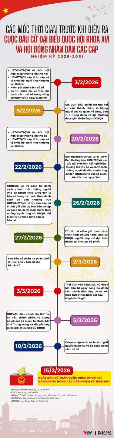 Các mốc thời gian trước cuộc bầu cử đại biểu Quốc hội khóa XVI và HĐND các cấp Ngày 15/3/2026 là Ngày toàn dân đi bầu cử ĐBQH khoá XVI và đại biểu HĐND các cấp nhiệm kỳ 2026-2031.