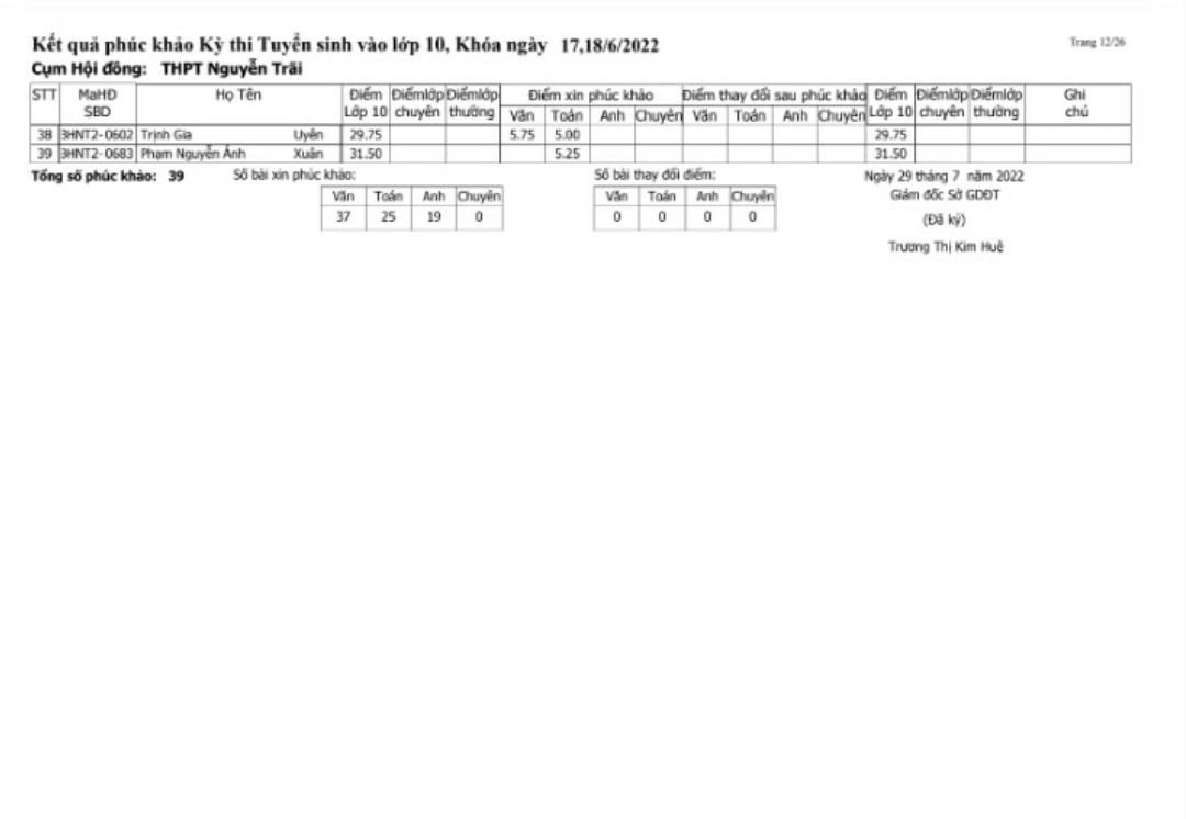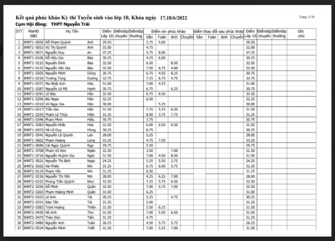 SƠ ĐỒ PHÒNG HỌC 2022-2023, KẾT QUẢ PHÚC KHẢO VÀO LỚP 10 01.08.2022 04:59 | 6.413 Share with friends Bài liên quan Thông báo về kỳ thi tuyển dụng viên chức trường THPT Nguyễn Trãi năm 2026 (12.03.2026 03:28) Thông báo: Tuyển dụng viên chức Trường THPT Nguyễn Trãi, tỉnh Đồng Nai năm 2025 (31.12.2025 02:12) Thông báo về việc triển khai hồ sơ mẫu các TTHC phát sinh hồ sơ và clip hướng dẫn nộp hồ sơ trên cổng Dịch vụ công quốc gia (25.11.2025 10:38) Thông báo và hướng dẫn chế độ miễn giảm năm học 2025-2026 (24.11.2025 04:57) Thông báo các khoản thu đầu năm học 2025-2026 (24.11.2025 04:44) Kết quả phúc khảo kỳ thi TN THPT QG trường THPT Nguyễn Trãi năm học 2024-2025 (14.08.2025 08:03) Thông báo: Kết quả phúc khảo kỳ thi tuyển sinh vào lớp 10, khóa ngày 29/30 - 05 - 2025 (31.07.2025 06:07) Kế hoạch thực hiện đổi môn học tự chọn, chuyên đề tự chọn chương trình GDPT năm 2018 với khối 10, 11 năm học 2024-2025 lên khối 11, 12 năm học 2025-2026 (17.07.2025 10:44) Thông báo kế thời gian học sinh lớp 10 (2025-2026) nhận SGK và đồng phục môn Quốc phòng an ninh (17.07.2025 10:30) Thông báo trúng tuyển và nhập học lớp 10 năm học 2025-2026 (12.06.2025 06:00) Danh sách học sinh trúng tuyển vào trường THPT Nguyễn Trãi năm học 2025-2026 và thời gian nộp hồ sơ nhập học (11.06.2025 05:03) Thông báo kế hoạch thi thử Tốt nghiệp THPT 2025 (02.05.2025 09:44) LỊCH KIỂM TRA HỌC KỲ II - NĂM HỌC 2024-2025 (16.04.2025 09:05) Từ 1/6, thẻ BHYT giấy hết hiệu lực: Người dân cần làm gì để không mất quyền lợi? (28.03.2025 10:00) Thông báo số điện thoại đường dây nóng của Sở GD&ĐT Đồng Nai về phản ánh của người dân về dạy thêm, học thêm (24.03.2025 10:32) Lịch kiểm tra cuối kỳ I Năm học 2024-2025 (18.12.2024 07:37) VỀ CẤP PHIẾU LÝ LỊCH TƯ PHÁP TRÊN VNEID TRÊN ĐỊA BÀN TỈNH ĐỒNG NAI (27.11.2024 02:28) Lịch kiểm tra giữa kỳ I (21.10.2024 10:15) Thông báo tuyển dụng viên chức năm 2024 (08.08.2024 04:08) Thông báo điểm chuẩn tuyển sinh vào 10 năm học 2024-2025 (18.06.2024 03:16) 1234